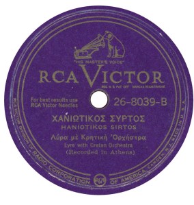 Although this label indicates the lead instrument is the Cretan lyra (a pear-shaped, three-stringed bowed fiddle), my Cretan-music-playing friend Al Davidson insists it’s actually a violin. While Haniotikos simply means “from the city of Hania”, the Crete’s second largest city located along the northwest coast, the fast and wild sounds of this recording suggests it may actually be from the nearby city of Kissamos.